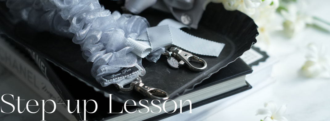 日常を彩るルームシューズやスマホストラップ、バッグチャームなどコーディネートアイテムのリボンワークを学びます。